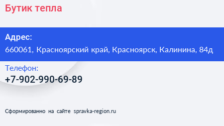 Бутик тепла по адресу 660061, Красноярский край, Красноярск, Калинина, 84д в дальнейшем Организация, размещена в следующих категориях: