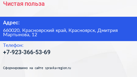Чистая польза по адресу 660020, Красноярский край, Красноярск, Дмитрия Мартынова, 12 в дальнейшем Организация, размещена в следующих категориях: