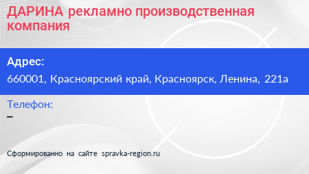 ДАРИНА, рекламно-производственная компания по адресу 660001, Красноярский край, Красноярск, Ленина, 221а в дальнейшем Организация, размещена в следующих категориях: