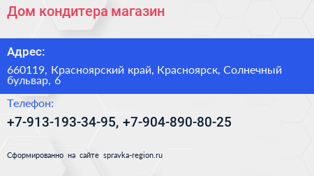 Дом кондитера, магазин по адресу 660119, Красноярский край, Красноярск, Солнечный бульвар, 6 в дальнейшем Организация, размещена в следующих категориях: