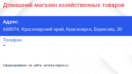 Домашний, магазин хозяйственных товаров по адресу 660074, Красноярский край, Красноярск, Борисова, 30 в дальнейшем Организация, размещена в следующих категориях: