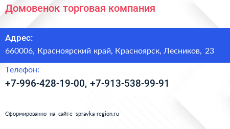 Домовенок, торговая компания по адресу 660006, Красноярский край, Красноярск, Лесников, 23 в дальнейшем Организация, размещена в следующих категориях: