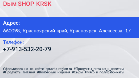 Dым SHOP KRSK по адресу 660098, Красноярский край, Красноярск, Алексеева, 17 в дальнейшем Организация, размещена в следующих категориях: