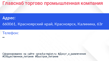 Главснаб, торгово-промышленная компания по адресу 660061, Красноярский край, Красноярск, Калинина, 63г в дальнейшем Организация, размещена в следующих категориях: