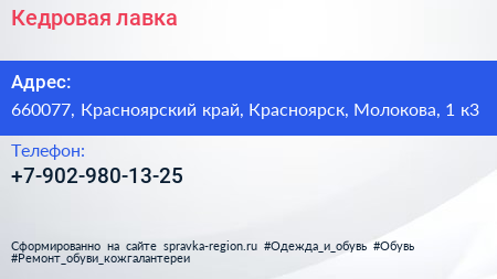 Кедровая лавка по адресу 660077, Красноярский край, Красноярск, Молокова, 1 к3 в дальнейшем Организация, размещена в следующих категориях: