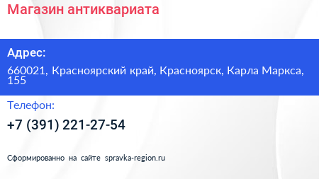 Магазин антиквариата по адресу 660021, Красноярский край, Красноярск, Карла Маркса, 155 в дальнейшем Организация, размещена в следующих категориях: