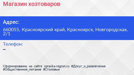 Магазин хозтоваров по адресу 660055, Красноярский край, Красноярск, Новгородская, 2/1 в дальнейшем Организация, размещена в следующих категориях: