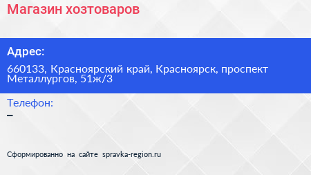 Магазин хозтоваров по адресу 660133, Красноярский край, Красноярск, проспект Металлургов, 51ж/3 в дальнейшем Организация, размещена в следующих категориях: