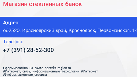 Магазин стеклянных банок по адресу 662520, Красноярский край, Красноярск, Первомайская, 14 в дальнейшем Организация, размещена в следующих категориях: