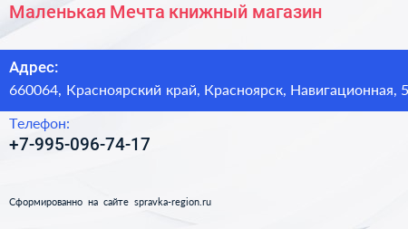 Маленькая Мечта, книжный магазин по адресу 660064, Красноярский край, Красноярск, Навигационная, 5 в дальнейшем Организация, размещена в следующих категориях: