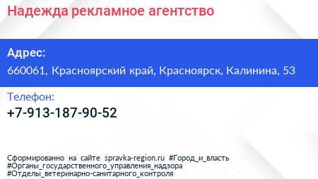 Надежда, рекламное агентство по адресу 660061, Красноярский край, Красноярск, Калинина, 53 в дальнейшем Организация, размещена в следующих категориях: