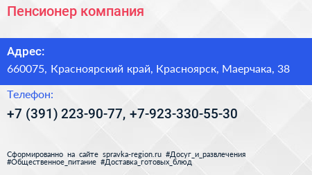Пенсионер, компания по адресу 660075, Красноярский край, Красноярск, Маерчака, 38 в дальнейшем Организация, размещена в следующих категориях: