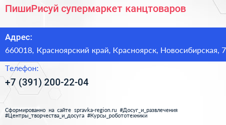 ПишиРисуй, супермаркет канцтоваров по адресу 660018, Красноярский край, Красноярск, Новосибирская, 7 в дальнейшем Организация, размещена в следующих категориях: