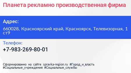 Планета, рекламно-производственная фирма по адресу 660028, Красноярский край, Красноярск, Телевизорная, 1 ст9 в дальнейшем Организация, размещена в следующих категориях: