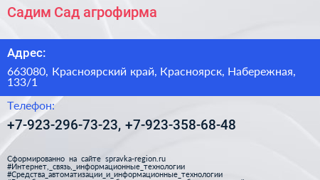 Садим Сад, агрофирма по адресу 663080, Красноярский край, Красноярск, Набережная, 133/1 в дальнейшем Организация, размещена в следующих категориях: