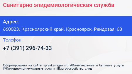 Санитарно-эпидемиологическая служба по адресу 660023, Красноярский край, Красноярск, Рейдовая, 68 в дальнейшем Организация, размещена в следующих категориях:
