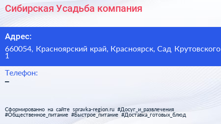 Сибирская Усадьба, компания по адресу 660054, Красноярский край, Красноярск, Сад Крутовского, 1 в дальнейшем Организация, размещена в следующих категориях: