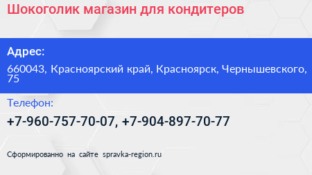 Шокоголик, магазин для кондитеров по адресу 660043, Красноярский край, Красноярск, Чернышевского, 75 в дальнейшем Организация, размещена в следующих категориях: