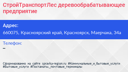 СтройТранспортЛес, деревообрабатывающее предприятие по адресу 660075, Красноярский край, Красноярск, Маерчака, 34а в дальнейшем Организация, размещена в следующих категориях: