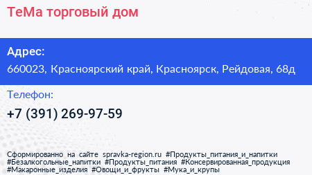 ТеМа, торговый дом по адресу 660023, Красноярский край, Красноярск, Рейдовая, 68д в дальнейшем Организация, размещена в следующих категориях: