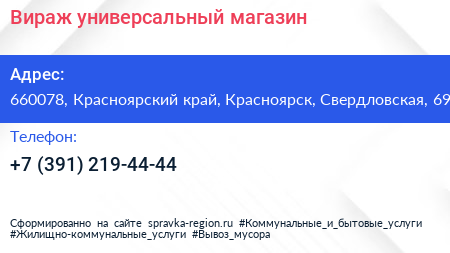 Вираж, универсальный магазин по адресу 660078, Красноярский край, Красноярск, Свердловская, 69 в дальнейшем Организация, размещена в следующих категориях: