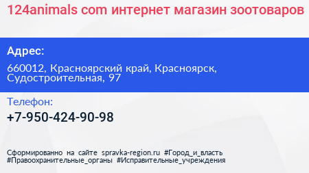 124animals.com, интернет-магазин зоотоваров по адресу 660012, Красноярский край, Красноярск, Судостроительная, 97 в дальнейшем Организация, размещена в следующих категориях: