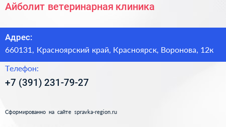 Айболит, ветеринарная клиника по адресу 660131, Красноярский край, Красноярск, Воронова, 12к в дальнейшем Организация, размещена в следующих категориях: