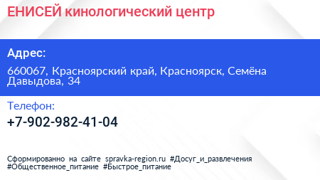 ЕНИСЕЙ, кинологический центр по адресу 660067, Красноярский край, Красноярск, Семёна Давыдова, 34 в дальнейшем Организация, размещена в следующих категориях: