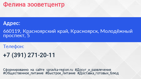Фелина, зооветцентр по адресу 660119, Красноярский край, Красноярск, Молодёжный проспект, 5 в дальнейшем Организация, размещена в следующих категориях: