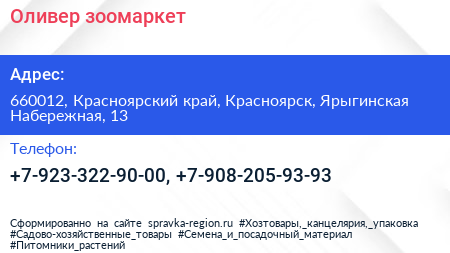 Оливер, зоомаркет по адресу 660012, Красноярский край, Красноярск, Ярыгинская Набережная, 13 в дальнейшем Организация, размещена в следующих категориях: