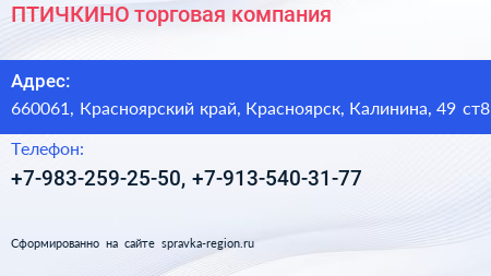 ПТИЧКИНО, торговая компания по адресу 660061, Красноярский край, Красноярск, Калинина, 49 ст8 в дальнейшем Организация, размещена в следующих категориях: