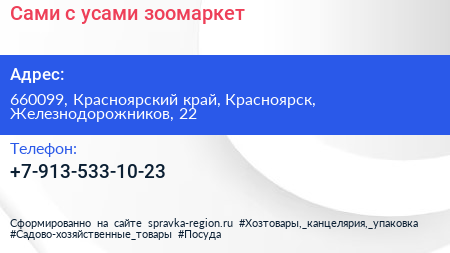 Сами с усами, зоомаркет по адресу 660099, Красноярский край, Красноярск, Железнодорожников, 22 в дальнейшем Организация, размещена в следующих категориях: