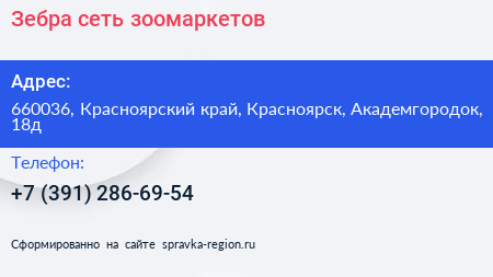 Зебра, сеть зоомаркетов по адресу 660036, Красноярский край, Красноярск, Академгородок, 18д в дальнейшем Организация, размещена в следующих категориях:
