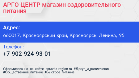 АРГО ЦЕНТР, магазин оздоровительного питания по адресу 660017, Красноярский край, Красноярск, Ленина, 95 в дальнейшем Организация, размещена в следующих категориях: