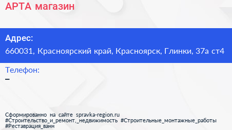 АРТА, магазин по адресу 660031, Красноярский край, Красноярск, Глинки, 37а ст4 в дальнейшем Организация, размещена в следующих категориях: