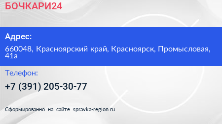 БОЧКАРИ24 по адресу 660048, Красноярский край, Красноярск, Промысловая, 41а в дальнейшем Организация, размещена в следующих категориях: