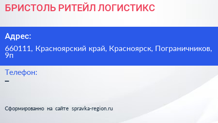 БРИСТОЛЬ РИТЕЙЛ ЛОГИСТИКС по адресу 660111, Красноярский край, Красноярск, Пограничников, 9п в дальнейшем Организация, размещена в следующих категориях: