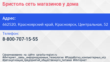 Бристоль, сеть магазинов у дома по адресу 662520, Красноярский край, Красноярск, Центральная, 52 в дальнейшем Организация, размещена в следующих категориях: