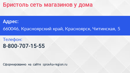 Бристоль, сеть магазинов у дома по адресу 660046, Красноярский край, Красноярск, Читинская, 5 в дальнейшем Организация, размещена в следующих категориях:
