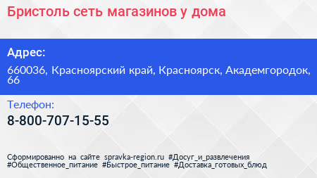 Бристоль, сеть магазинов у дома по адресу 660036, Красноярский край, Красноярск, Академгородок, 66 в дальнейшем Организация, размещена в следующих категориях: