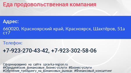 Еда, продовольственная компания по адресу 660020, Красноярский край, Красноярск, Шахтёров, 51а ст7 в дальнейшем Организация, размещена в следующих категориях:
