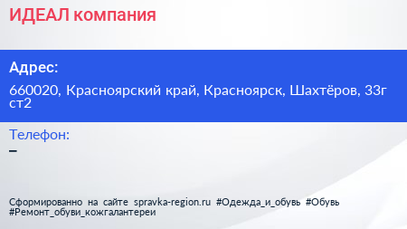ИДЕАЛ, компания по адресу 660020, Красноярский край, Красноярск, Шахтёров, 33г ст2 в дальнейшем Организация, размещена в следующих категориях: