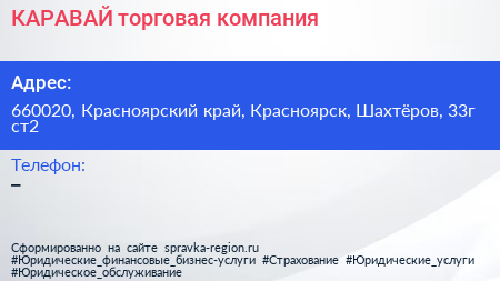 КАРАВАЙ, торговая компания по адресу 660020, Красноярский край, Красноярск, Шахтёров, 33г ст2 в дальнейшем Организация, размещена в следующих категориях: