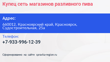 Купец, сеть магазинов разливного пива по адресу 660012, Красноярский край, Красноярск, Судостроительная, 25а в дальнейшем Организация, размещена в следующих категориях:
