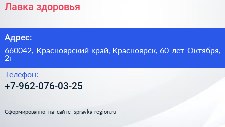 Лавка здоровья по адресу 660042, Красноярский край, Красноярск, 60 лет Октября, 2г в дальнейшем Организация, размещена в следующих категориях: