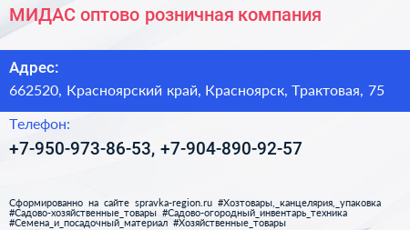 МИДАС, оптово-розничная компания по адресу 662520, Красноярский край, Красноярск, Трактовая, 75 в дальнейшем Организация, размещена в следующих категориях: