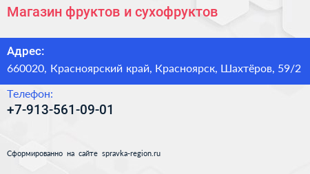 Магазин фруктов и сухофруктов по адресу 660020, Красноярский край, Красноярск, Шахтёров, 59/2 в дальнейшем Организация, размещена в следующих категориях: