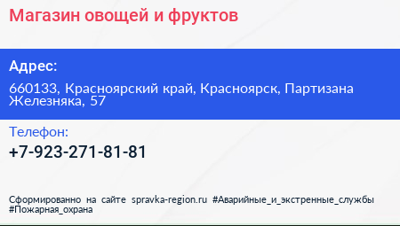 Магазин овощей и фруктов по адресу 660133, Красноярский край, Красноярск, Партизана Железняка, 57 в дальнейшем Организация, размещена в следующих категориях: