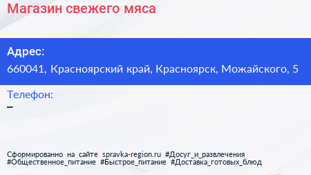 Магазин свежего мяса по адресу 660041, Красноярский край, Красноярск, Можайского, 5 в дальнейшем Организация, размещена в следующих категориях: