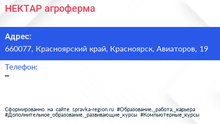 НЕКТАР, агроферма по адресу 660077, Красноярский край, Красноярск, Авиаторов, 19 в дальнейшем Организация, размещена в следующих категориях: